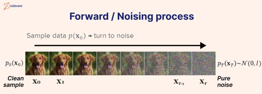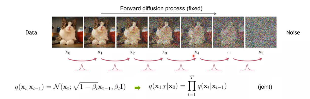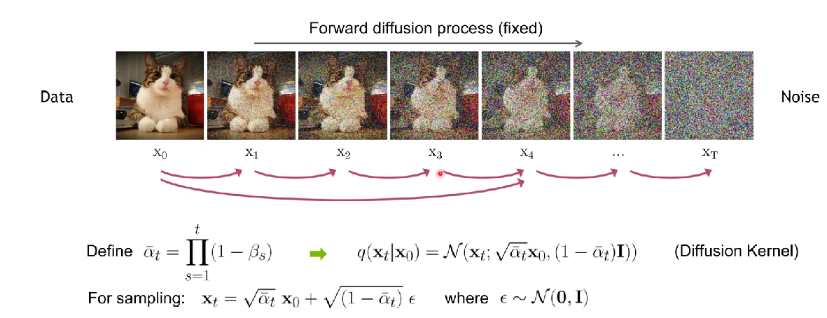 어떤 시점 t에 대해서 $x_{t-1}$ 이미지에서 $x_t$이미지로 넘어가는 step에서 수학적으로 스케줄링 된 랜덤한 noise를 이미지에 붙인다.